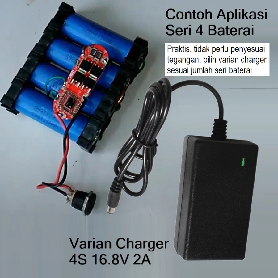 3. 4S – 16.8V : untuk 4 buah Baterai 18650 dengan rangkaian seri tegangan 16.8V dan arus charging 0.7A